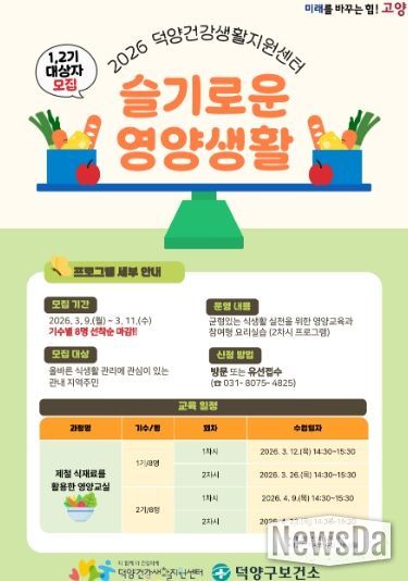 뉴스다 최광묵 기자 | 고양특례시 덕양구보건소 덕양건강생활지원센터는 지역주민의 건강한 식생활 실천을 돕기 위해 영양교육과 요리실습을 결합한 프로그램 ‘슬기로운 영양생활’ 1·2기 참여자를 모집한다.