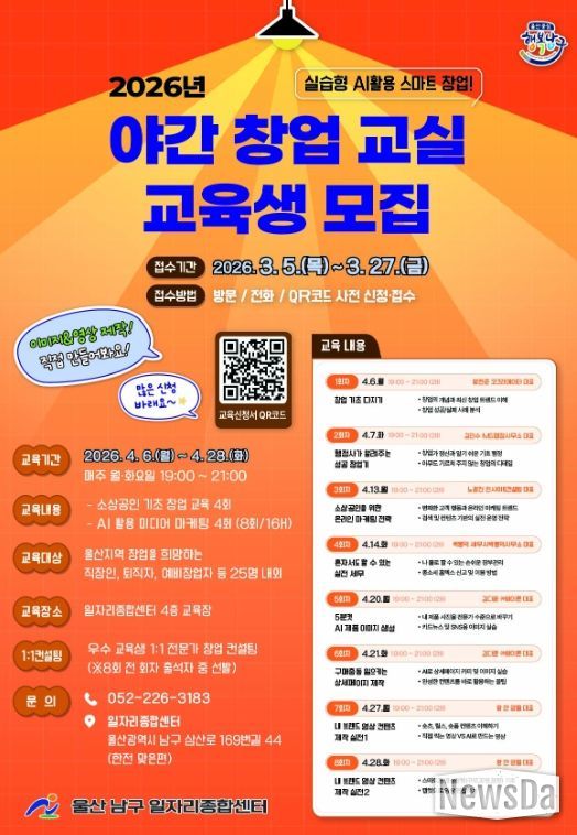 뉴스다 최광묵 기자 | 울산 남구 일자리종합센터는 창업의 사각지대를 없애고 창업 저변을 확대하기 위해 ‘2026년 야간 창업 교실’ 교육생을 모집한다고 밝혔다.