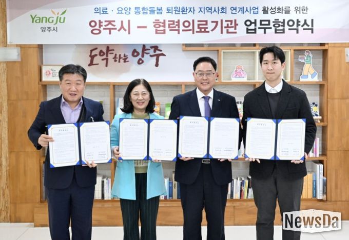 뉴스다 최광묵 기자 | 양주시는 11일 시장실에서 양주예쓰병원, 경기도의료원 의정부병원과 퇴원환자의 안정적인 지역사회 정착과 원활한 사회 복귀를 지원하기 위해 ‘퇴원환자 지역사회 연계 업무협약’을 체결했다.