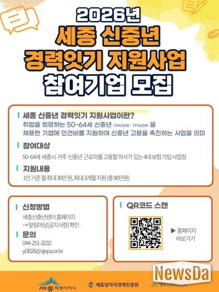 뉴스다 최광묵 기자 | (재)세종일자리경제진흥원이 ‘2026년 세종 신중년 경력잇기 지원사업’(이하 ‘경력잇기 지원사업’) 참여 기업을 모집한다.