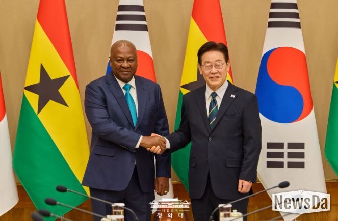뉴스다 최광묵 기자 | 이재명 대통령은 11일 오후 우리나라를 실무 방한한 존 드라마니 마하마 가나 대통령과 정상회담을 가졌다고 강유정 청와대 대변인이 서면 브리핑을 통해 밝혔다.