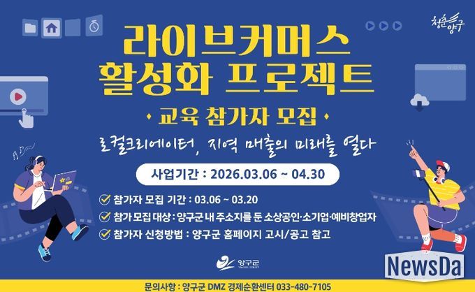 뉴스다 최광묵 기자 | 양구군은 지역 소상공인과 소기업, 예비창업자의 온라인 판매 역량 강화를 위해 ‘라이브커머스 활성화 프로젝트 교육’ 참가자를 모집한다.