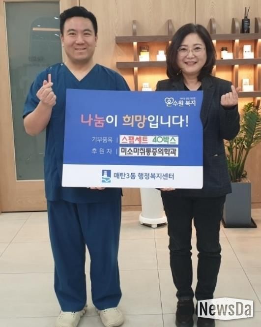 뉴스다 최광묵 기자 | 수원시 영통구 매탄3동은 지난 11일 미소마취통증의학과의원이 지역사회 내 어려운 이웃을 돕기 위해 100만 원 상당의 스팸 세트 등 식료품을 매탄3동 행정복지센터에 전달했다고 밝혔다.