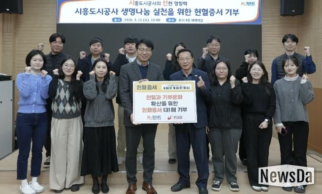 뉴스다 최광묵 기자 | 시흥도시공사는 지난 11일 임직원 단체 헌혈 행사를 통해 직원들에게 기부받은 ‘헌혈증 131매’를, 대한산업보건협회 한마음혈액원에 전달하면서 ‘생명 나눔’을 실천했다고 밝혔다.