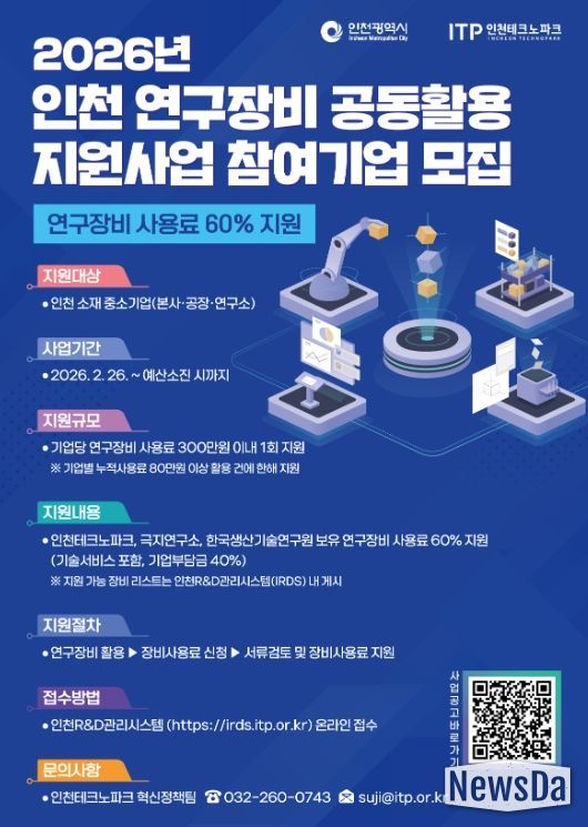 뉴스다 최광묵 기자 | 인천테크노파크(인천TP)는 인천 지역 중소기업의 연구개발(R·D) 역량을 높이고 장비 사용료 부담을 줄여주기 위해, ‘2026년 인천 연구장비 공동활용 지원사업’ 참여기업을 모집한다고 밝혔다.