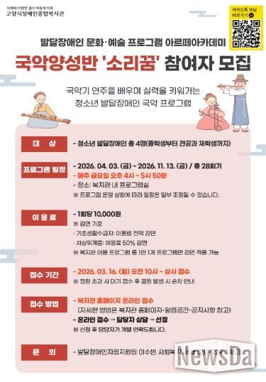 뉴스다 최광묵 기자 | 고양시장애인종합복지관은 청소년 발달장애인을 대상으로 국악기 연주를 배우고 실력을 키울 수 있는 국악 프로그램 국악양성반 ‘소리꿈’ 참여자를 모집한다.