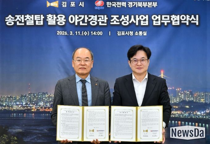 뉴스다 최광묵 기자 | 김포시와 한국전력공사 경기북부본부가 11일 ‘송전철탑 활용 야간경관 조성사업’ 추진을 위한 업무협약을 체결했다. 이번 협약은 송전철탑을 활용한 야간경관 랜드마크 조성을 통해 도시 환경과 전력 설비에 대한 이미지를 개선하고 시민들에게 새로운 볼거리를 제공하기 위해 마련됐다.