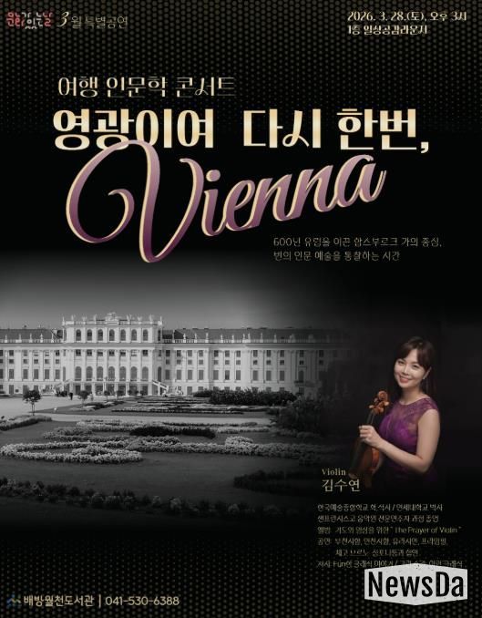 뉴스다 최광묵 기자 | 아산시 배방월천도서관은 오는 3월 28일, ‘문화가 있는 날’을 맞아 특별공연 ‘여행 인문학 콘서트: 영광이여 다시 한번, 비엔나’를 개최한다.