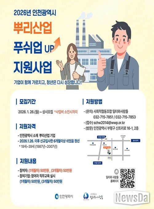 뉴스다 최광묵 기자 | 인천광역시는 뿌리산업의 고용 안정성을 강화하고 청년의 노동시장 진입을 지원하기 위해‘멘토멘티 백일업(UP) 지원사업’과 ‘뿌리산업 푸쉬업(UP) 지원사업’을 추진한다.