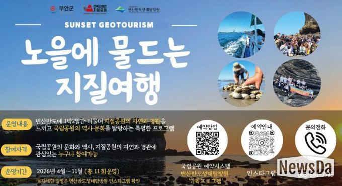 뉴스다 최광묵 기자 | 부안군은 2026년 지오관광 활성화를 위해 전북 서해안 유네스코 세계지질공원과 변산반도 생태탐방원이 협력해 ‘노을에 물드는 지질여행(Sunset Geotourism)’ 프로그램을 이달부터 모집·운영한다고 밝혔다.