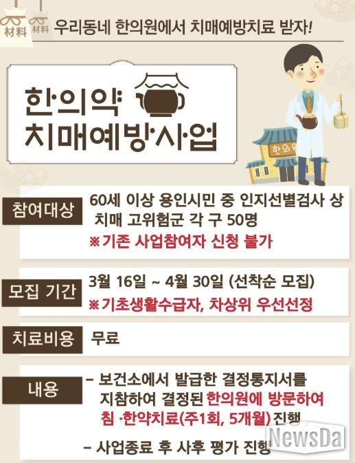 뉴스다 최광묵 기자 | 용인특례시는 시민의 건강한 노후를 지원하기 위해 16일부터 ‘2026년 한의약 치매예방 프로그램’ 참여자를 모집한다고 밝혔다.