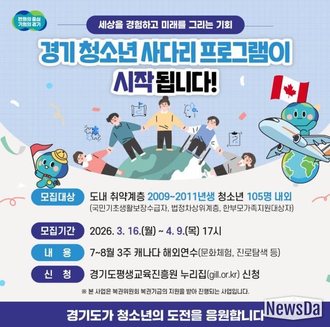 뉴스다 최광묵 기자 | 경기도가 오는 4월 9일까지 ‘2026년도 경기 청소년 사다리’ 사업 참가자 105명을 모집한다.