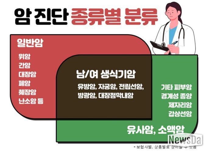 일반적으로 보험사에서 암을 구분할 때에는 일반암, 유사암, 소액암, 고액암 등으로 분류를 하고 있다. 유사암은 보통 경계성종양, 제자리암, 갑상선암, 기타피부암이 해당되고 소액암은 유방암, 방광암, 전립선암, 자궁암이 해당된다. 그리고 고액암은 뼈암이나 뇌암, 췌장암 등이 해당되며 이들을 제외한 나머지 암을 일반암으로 분류한다. 보통 치료비가 많이 드는 고액암이 다른 암보다 진단금이 높은 편이지만, 폭넓은 보장을 위해서는 일반암 진단비를 늘리는 것이 유리하다. 또한, 유사암이나 소액암은 비교적 치료가 간단하고 비용도 적게 들지만 발생빈도가 높은 관계로 보통 일반암 진단비의 10%~20% 정도만 지급되므로 사전에 보장금액을 살펴볼 필요가 있다.
