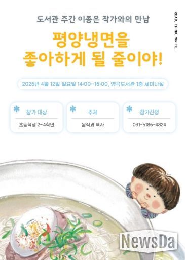 뉴스다 최광묵 기자 | 양곡도서관은 ‘『평양냉면을 좋아하게 될 줄이야』를 읽고 우리 음식 속에 숨은 가슴 시린 역사를 마주해 보아요’라는 주제로 '이종은 작가와의 만남'을 오는 4월 12일 오후 2시에 개최한다.