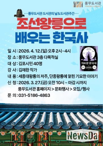 뉴스다 최광묵 기자 | 김포시 풍무도서관은 오는 4월 12일 오후 2시부터 인문학 프로그램 ‘조선왕릉으로 배우는 한국사’를 운영한다.