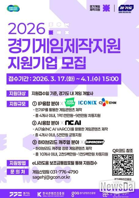 뉴스다 최광묵 기자 | 경기도와 경기콘텐츠진흥원이 도내 게임 기업의 경쟁력 강화와 글로벌 시장 진출을 위해 ‘2026년 경기게임제작지원’과 ‘2026년 게임 상용화 지원’ 사업 참여기업을 오는 4월 1일까지 모집한다.