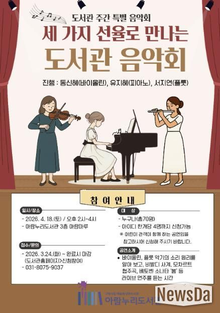 뉴스다 최광묵 기자 | 고양특례시 아람누리도서관은 오는 4월 18일 오후 2시 도서관 주간 맞이 특별 공연 ‘세 가지 선율로 만나는 도서관 음악회’를 개최한다.