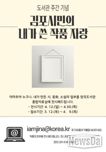 뉴스다 최광묵 기자 | 김포시 양곡도서관이 4월 12일부터 4월 30일까지 시민들의 창작 작품을 소개하는 전시회 ‘김포시민의 내가 쓴 작품자랑’을 운영한다.