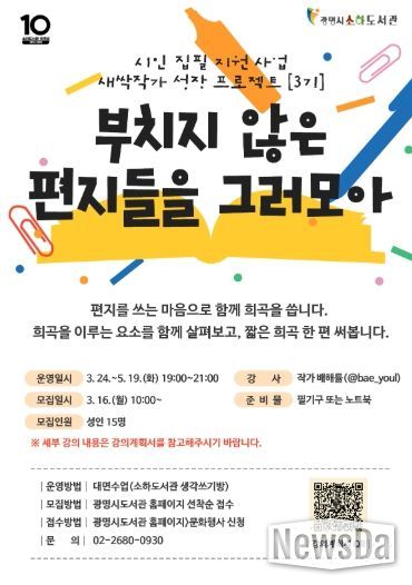 뉴스다 최광묵 기자 | 광명시 소하도서관은 시민들의 인문학적 소양을 함양하고 창작 활동을 지원하기 위해 ‘새싹작가 성장 프로젝트 3기’ 수강생을 지난 16일부터 모집하고 있다.