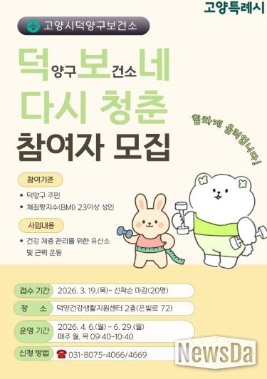 뉴스다 최광묵 기자 | 고양특례시 덕양구보건소는 지역 주민의 건강한 체중 관리와 활력 있는 일상을 돕기 위해‘덕보네 다시 청춘’ 프로그램 참여자를 모집한다고 17일 밝혔다.