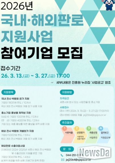 뉴스다 최광묵 기자 | 세종일자리경제진흥원은 지역 중소기업의 판로 확대와 수출경쟁력 강화를 위해 ‘2026년 세종시 국내·해외판로 지원사업’ 참여기업을 모집한다고 밝혔다.