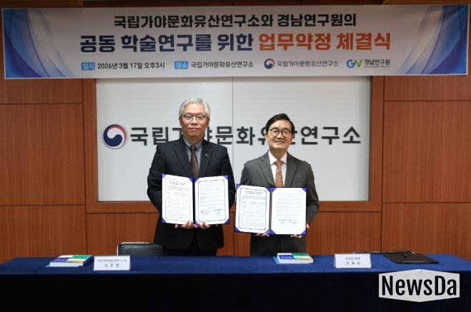 뉴스다 최광묵 기자 | 경남연구원과 국립가야문화유산연구소는 17일 국립가야문화유산연구소에서 경남 지역 문화유산의 체계적인 조사와 연구 협력 강화를 위해 업무협약을 체결했다.