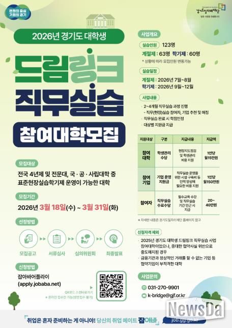 뉴스다 최광묵 기자 | 경기도와 경기도일자리재단이 ‘경기도 대학생 드림링크 직무실습’ 사업에 참여할 15개 협력대학을 31일까지 모집한다.