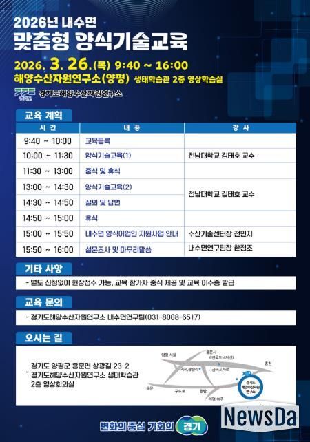 뉴스다 최광묵 기자 | 경기도해양자원연구소는 오는 26일 양평에 있는 연구소 생태학습관에서 내수면 양식 어업인의 역량 강화를 위한 양식기술교육을 실시한다.