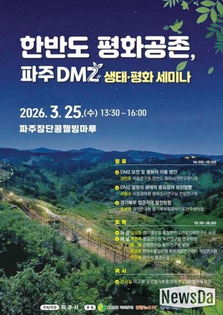 뉴스다 최광묵 기자 | 파주시는 오는 25일 13시부터 16시까지 파주장단콩웰빙마루(탄현면 필승로 396) 2층에서 ‘한반도 평화공존, 파주 디엠지(DMZ) 생태·평화 세미나’를 개최한다.