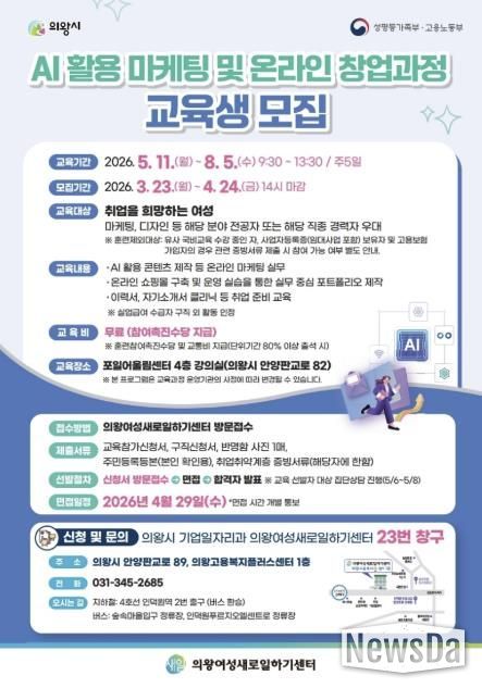 뉴스다 최광묵 기자 | 의왕여성새로일하기센터는 마케팅 사무원 분야 취업과 온라인 창업을 희망하는 여성 시민을 대상으로 ‘인공지능 활용 마케팅 및 온라인 창업과정’ 교육생을 모집한다.