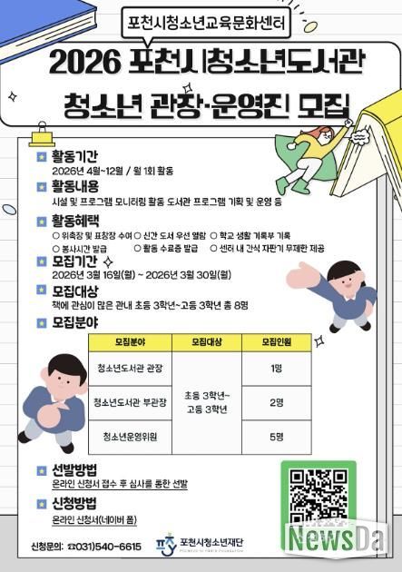 뉴스다 최광묵 기자 | 포천시청소년재단 포천시청소년교육문화센터는 청소년 참여형 도서관 운영을 위해 ‘2026년 포천시청소년도서관 청소년 관장 및 운영진’을 모집한다.