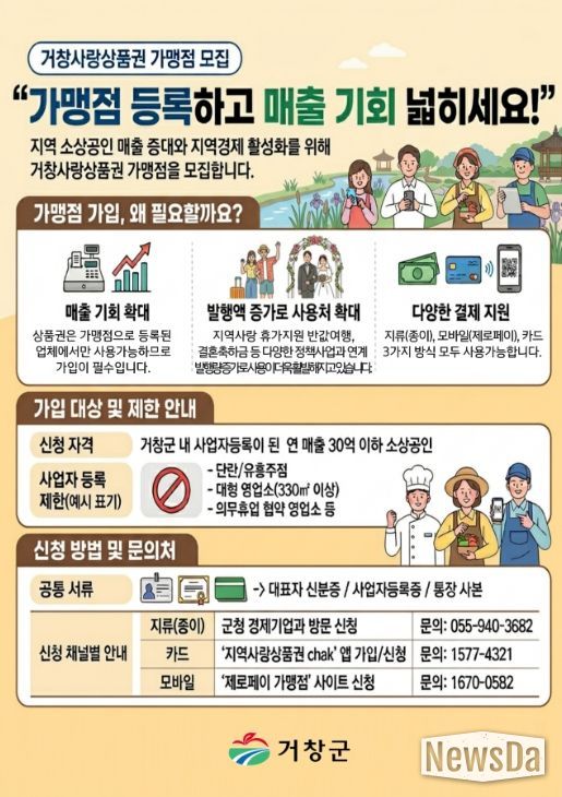 가맹 대상은 거창군에 사업자등록을 하고 영업 중인 연 매출 30억 원 이하 소상공인이며, 등록 시 신규 고객 유입과 매출 향상 효과를 기대할 수 있다.