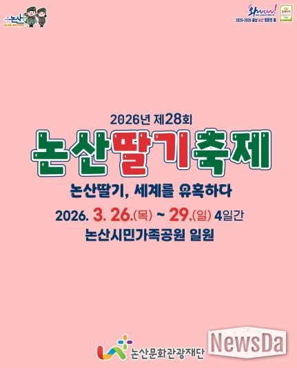 뉴스다 최광묵 기자 | 봄의 시작을 알리는 3월이면 생각나는 달콤한 ‘딸기’. 대한민국을 넘어 세계인의 입맛을 사로잡은 ‘논산 딸기’를 마음껏 맛보고 즐길 수 있는‘논산딸기축제’가 3월 26일부터 29일까지 4일간 개최된다.