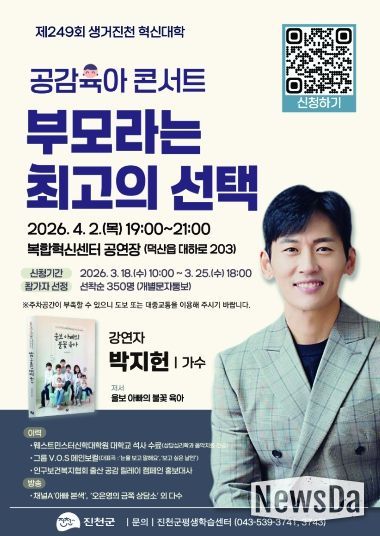 뉴스다 최광묵 기자 | 충북 진천군은 2026년 ‘생거진천 혁신대학’ 첫 강좌로 박지헌을 초청해 특별 강연을 개최한다고 밝혔다.