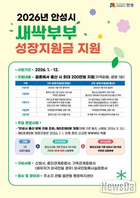 뉴스다 최광묵 기자 | 안성시는 3월 13일'안성시 출산·양육 지원 조례'일부개정을 통해 새싹부부성장지원금 연령 기준(49세이하 신혼부부)을 폐지하여 지원 대상을 확대했다.
