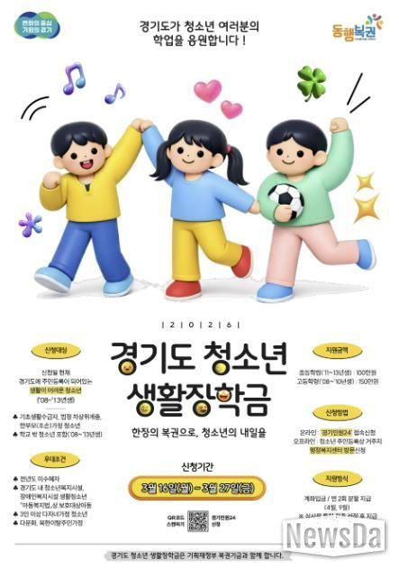 뉴스다 최광묵 기자 | 가평군은 복권기금을 재원으로 하는 ‘2026년 경기도 청소년 생활장학금’ 신청을 이달 16일부터 27일까지 접수한다.
