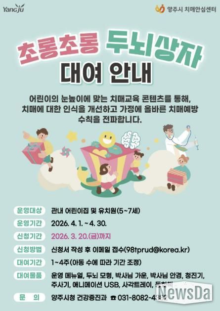 뉴스다 최광묵 기자 | 양주시서부치매안심센터는 어린이 대상 치매 인식개선사업인 ‘초롱초롱 두뇌상자’ 대여사업을 운영한다. 이번 사업은 어린이들의 눈높이에 맞춘 치매 교육을 통해 치매에 대한 올바른 이해를 돕고, 가족 내 치매 예방 실천 문화를 확산하기 위해 마련됐다.