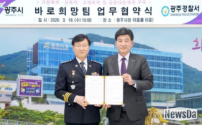 뉴스다 최광묵 기자 | 광주시는 18일 시청 이음홀에서 광주경찰서와 가정폭력·성폭력·교제 폭력 등 폭력 피해자에 대한 공동 대응을 위해 ‘바로희망팀’ 업무협약을 체결했다.