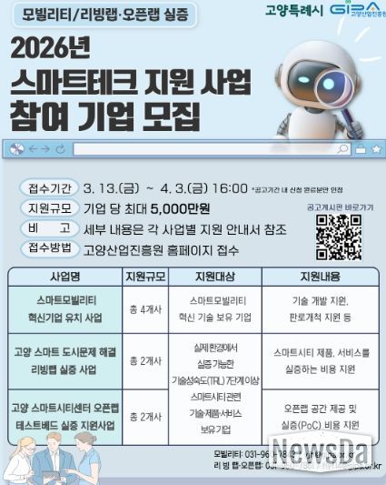 이번 모집은 ▲ 고양 스마트시티센터 오픈랩 테스트베드 실증 지원 사업 ▲ 고양 스마트 도시문제 해결 리빙랩 실증 사업 ▲ 스마트 모빌리티 혁신기업 유치 사업 세 분야로 진행된다.