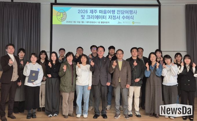 뉴스다 최광묵 기자 | 제주특별자치도와 제주관광공사(사장 고승철)은 3월 16일 월요일, 제주 웰컴센터에서 ‘2026 제주 마을 여행 전담 여행사 및 크리에이터’ 지정서 수여식을 개최하고 총 11개소를 공식 지정했다고 17일 밝혔다.
