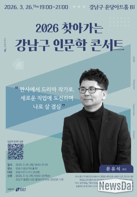뉴스다 최광묵 기자 | 꿈이 모이는 도시, 미래를 그리는 강남구가 2026년 ‘찾아가는 인문학 콘서트’를 본격 시작한다. 강남구 대표 문화행사로 자리 잡은 인문학 콘서트는 올해도 주민들이 생활권 가까이에서 인문학과 문화예술을 함께 누릴 수 있도록 연중 운영할 예정이며, 봄시즌 첫 무대로 문유석 작가와 신형철 작가를 초청해 3월과 4월 두 차례 강연을 연다.