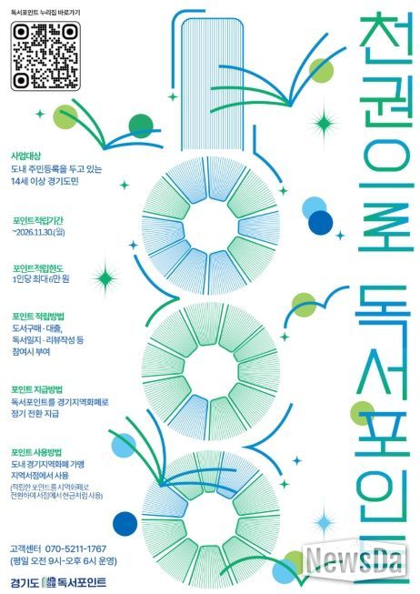 뉴스다 최광묵 기자 | 경기도가 도민 독서 습관 형성과 지역서점 이용 확대를 위한 ‘천권으로 독서포인트’ 사업을 개편했다. 적립 한도와 사용처를 확대하고 인증 절차를 간소화한 것이 핵심이다.