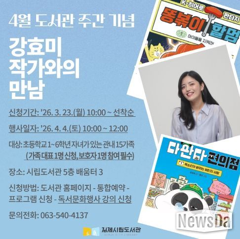 뉴스다 최광묵 기자 | 김제시립도서관은 4월 도서관 주간을 맞아 오는 4월 4일 토요일 오전 10시부터 ‘강효미 작가와의 만남’을 진행한다고 밝혔다.