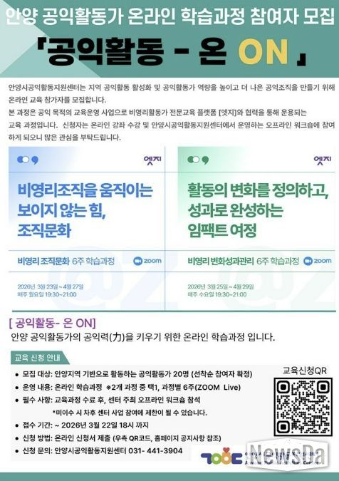 뉴스다 최광묵 기자 | 안양시공익활동지원센터가 지역 공익활동가들의 철학적 토대를 다지는 교육을 성공적으로 마친 데 이어, 실천적 전문성을 높이기 위한 온라인 교육 과정을 본격 가동하며 활동가 지원에 박차를 가하고 있다.