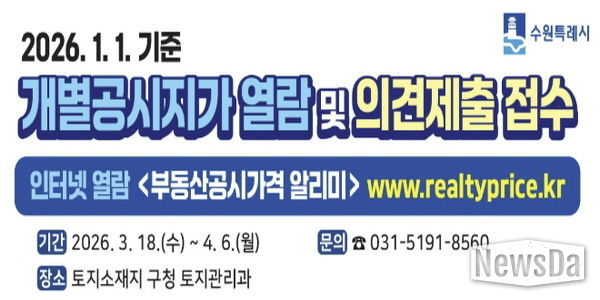 뉴스다 최광묵 기자 | 수원시 영통구는 3월 18일부터 4월 8일까지 20일간 2026년 1월 1일 기준 개별공시지가에 대한 열람을 실시하고 토지소유자 및 이해관계인의 의견을 접수한다.
