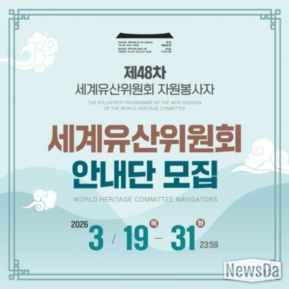 뉴스다 최광묵 기자 | 국가유산청 제48차 세계유산위원회 회의 준비기획단은 7월 부산에서 개최되는 제48차 유네스코 세계유산위원회 회의(48th Session of the World Heritage Committee)에 국내·외 청년들의 국제회의 현장 참여 기회를 제공하기 위하여 '세계유산위원회 안내단(World Heritage Committee Navigators)'의 참가자를 공개 모집한다.
