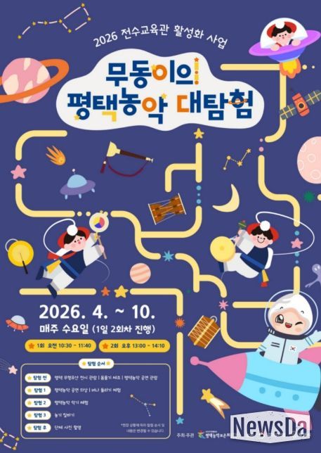 뉴스다 최광묵 기자 | 평택시는 오는 4월 29일부터 10월 28일까지 2026년 전수교육관 활성화 지원사업 ‘무동이의 평택농악 대탐험’을 평택무형유산 전수교육관에서 매주 수요일, 1일 2회차 총 38회를 운영한다고 밝혔다.