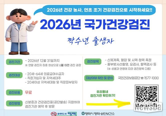 뉴스다 최광묵 기자 | 평택시는 2026년 새해를 맞아 시민들의 질병 예방과 건강증진을 위해 '2026년 국가건강검진 미리 받기’캠페인을 적극 추진한다고 밝혔다.