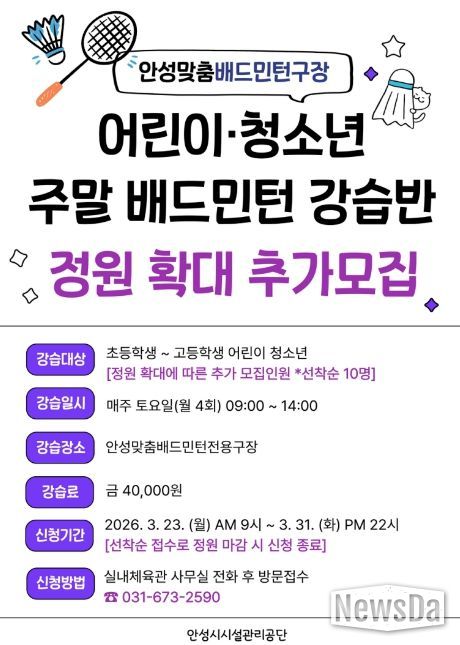 뉴스다 최광묵 기자 | 안성시시설관리공단은 안성 시민 생활체육 활성화를 위해 현재 운영 중인 주말 어린이・청소년 배드민턴 강습반 정원을 확대하고 추가 수강생을 모집한다고 밝혔다.