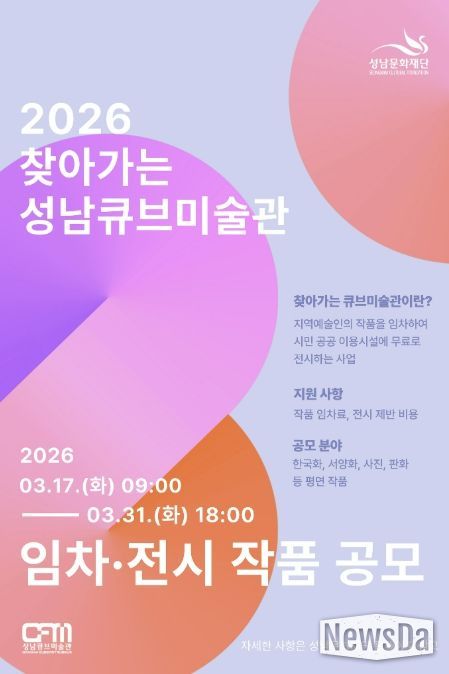 뉴스다 최광묵 기자 | 성남문화재단은 지역예술인의 창작 환경 지원을 다각화하고 시민들의 문화예술 향유기회를 확대하고자 ‘2026 찾아가는 성남큐브미술관’ 작품 임차 공모를 진행한다.